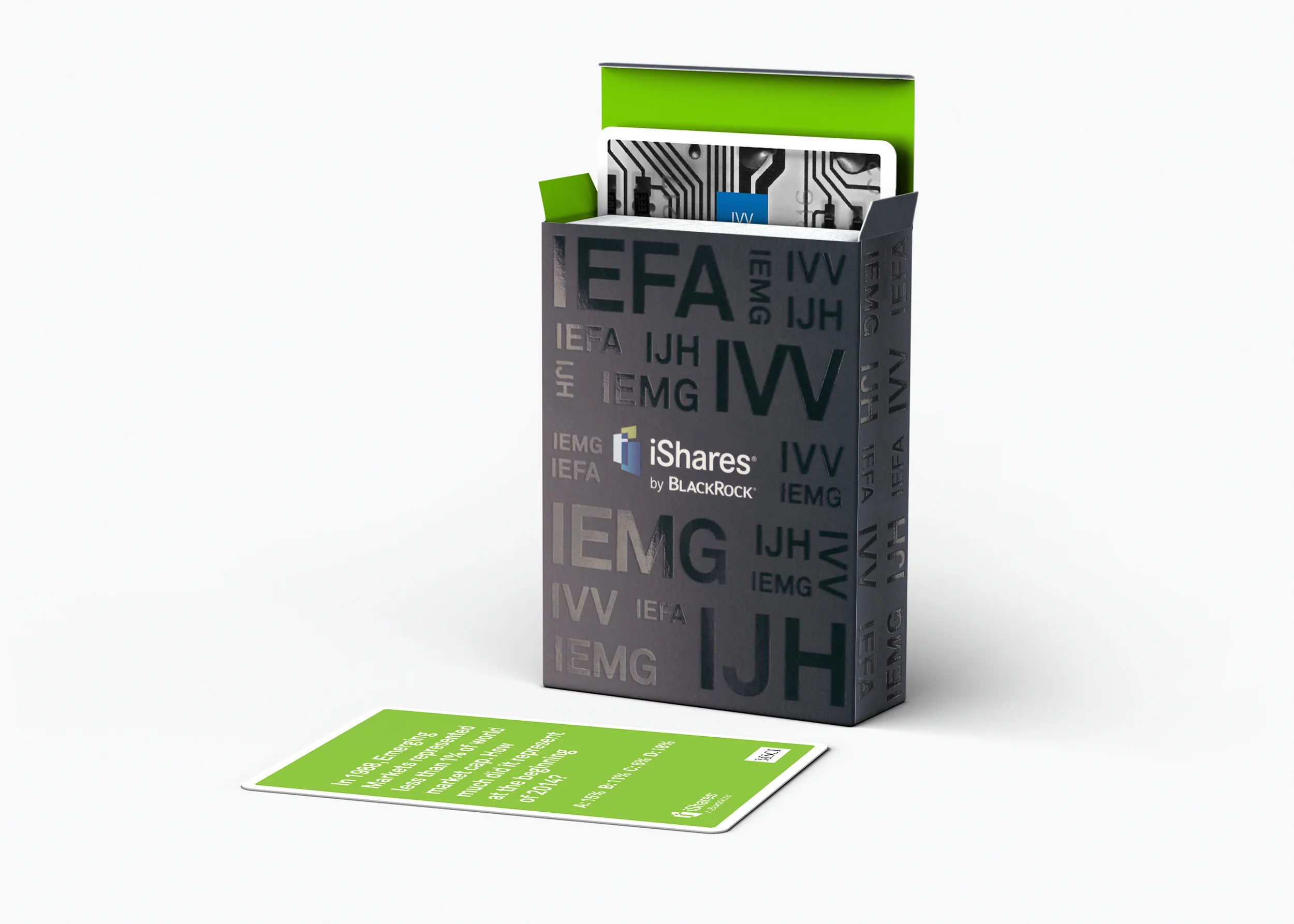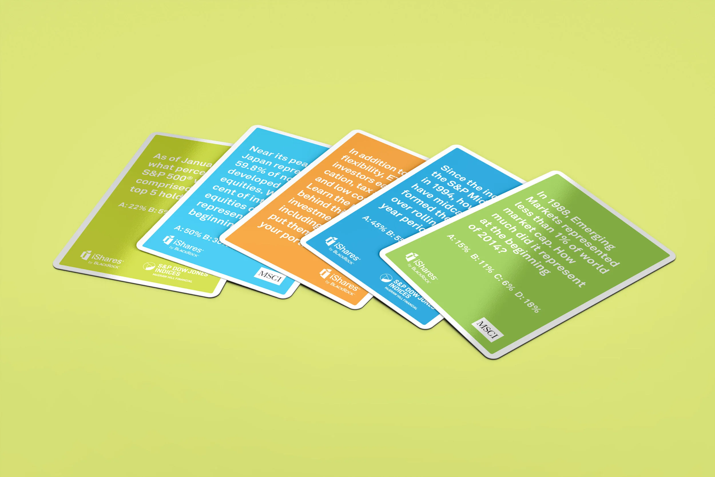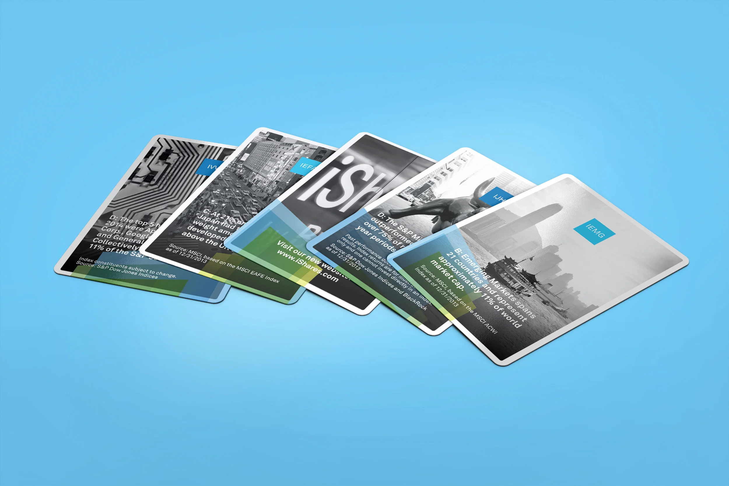 I created a fun and unique event give away item promoting the iShares suite of exchange traded funds. Each card was a quiz directing participants to an online promotion encouraging them to learn more. The cards were used as a direct mail campaign and given away at trade shows and events throughout the year.